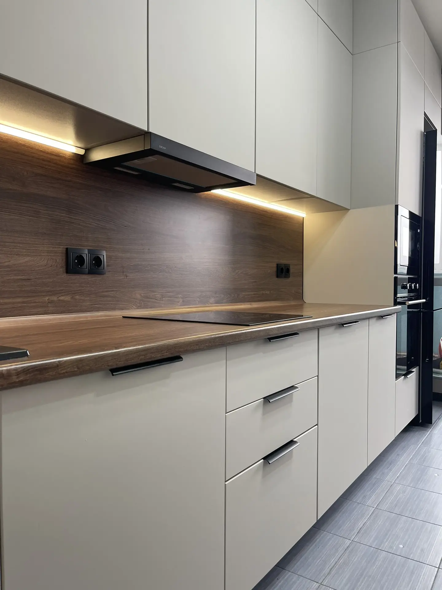 ▪️ Размер кухни: 3200х1200х2500 (ШхВхГ) ▪️ Корпус ЛДСП ▪️ Фасады МДФ в пленке фрезеровка Волна ( Ирбис) ▪️ Столешница искусственнный камень ▪️ Ручка Gola ▪️ Петли Blum (Австрия) ▪️ Подсветка рабочей зоны ▪️ Сушка для посуды хром Boyard