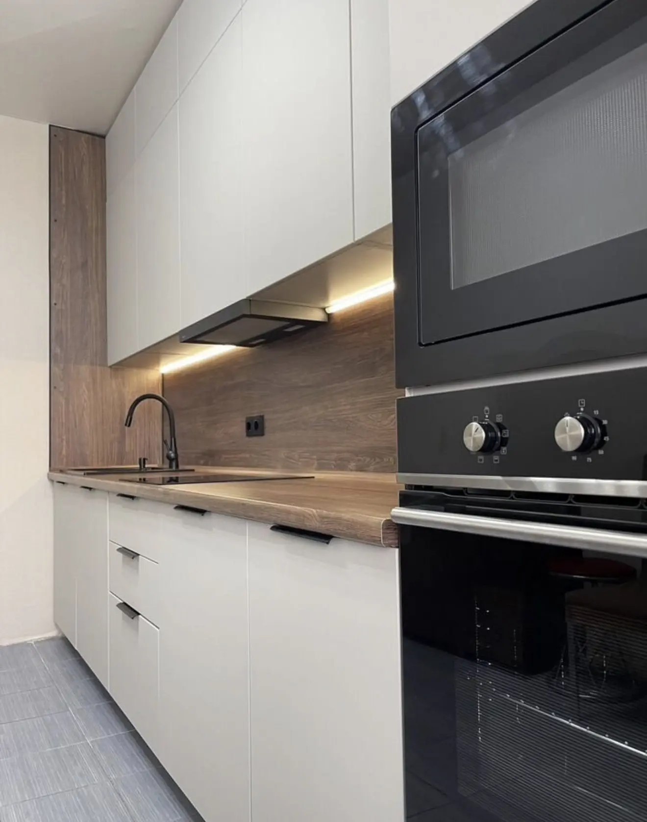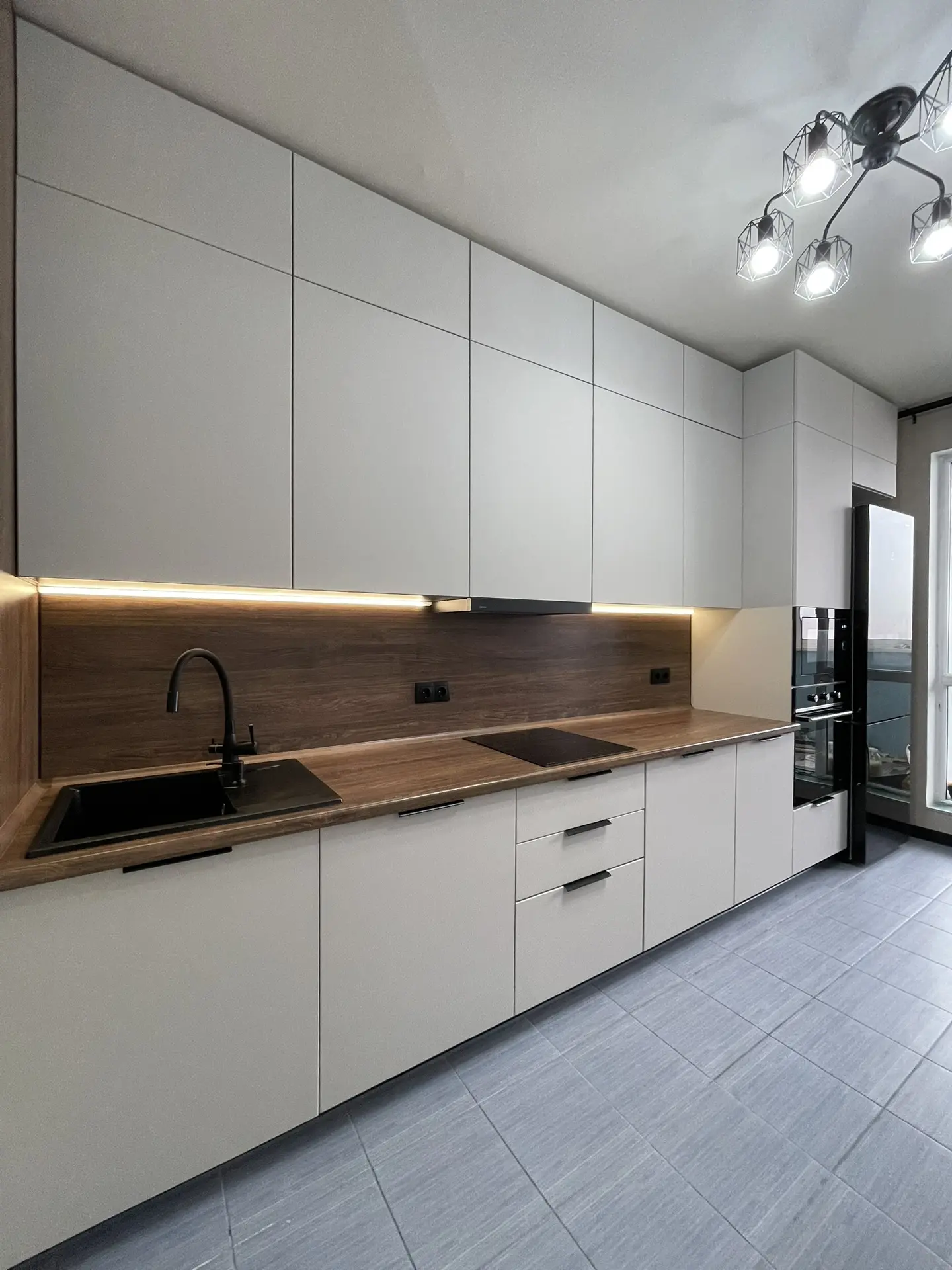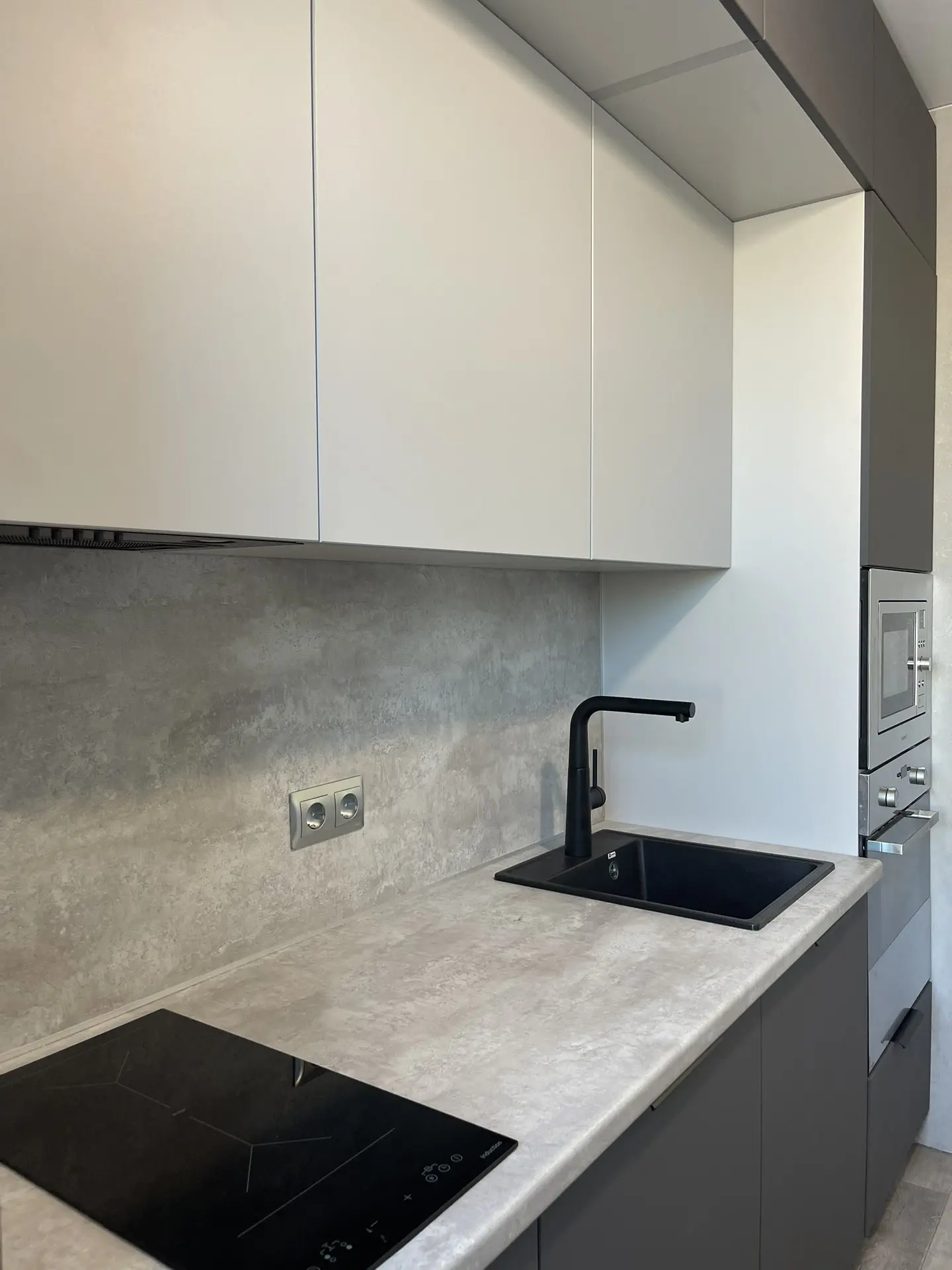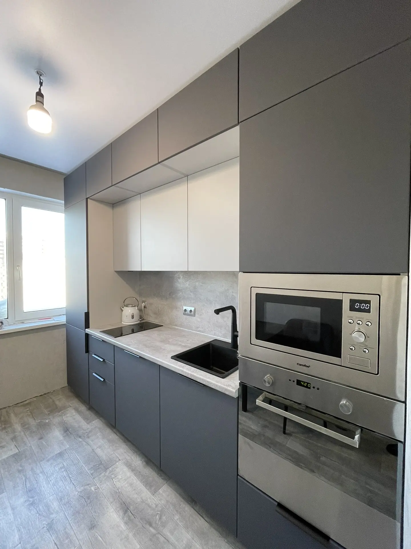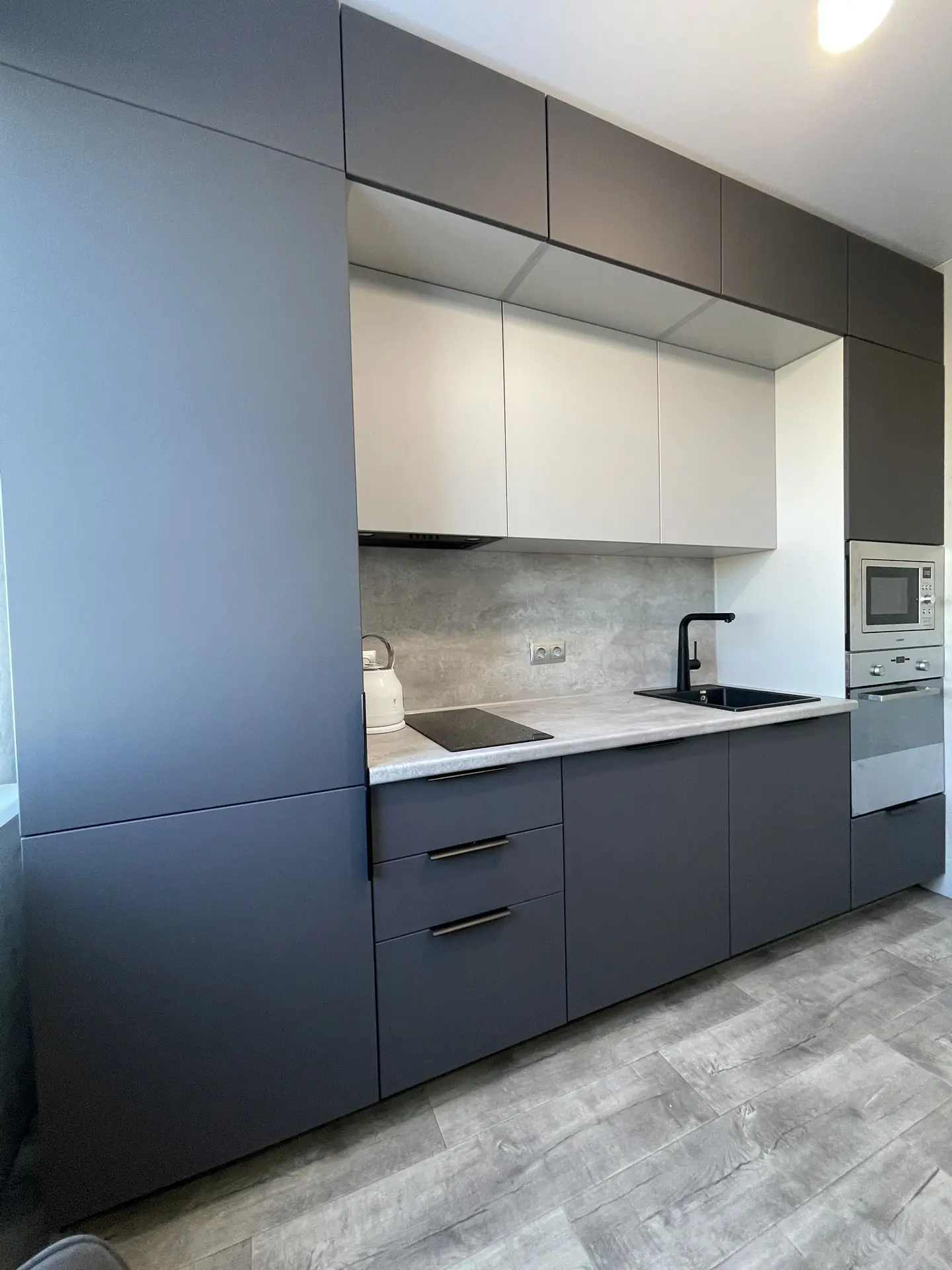 ▪️ Размер: 1500x2350x1300 (ШхВхГ) ▪️ Корпус ЛДСП белый ▪️ Фасады МДФ в пленке графит софт тач ▪️ Столешница 38 мм ДСП в пластике ▪️ Стеновая панель 6 мм МДФ в пластике ▪️ Ручки скоба ▪️ Петли с доводчиком GTV ▪️ Мойка искуственный камень + смеситель ▪️ Сушка для посуды хром