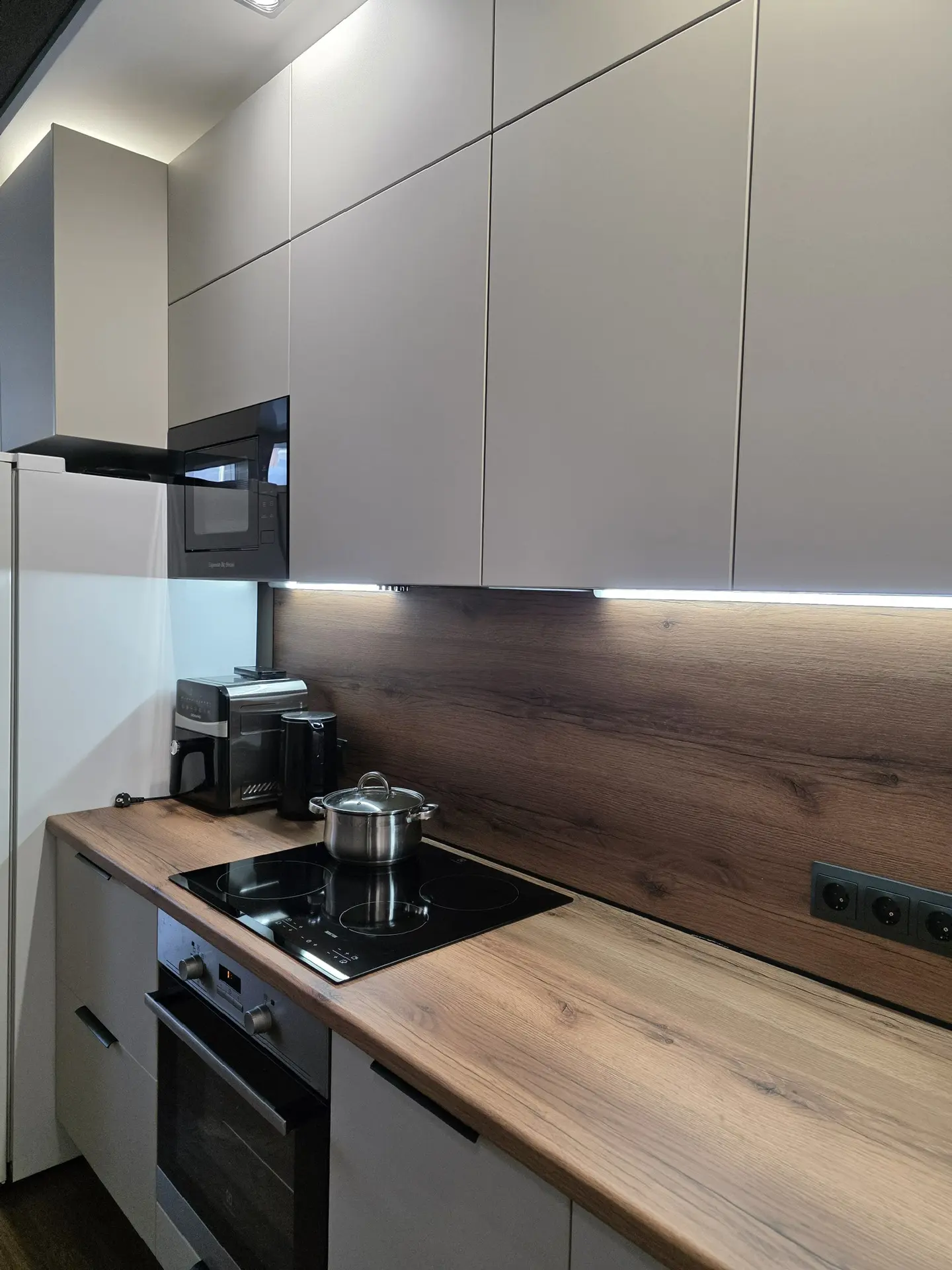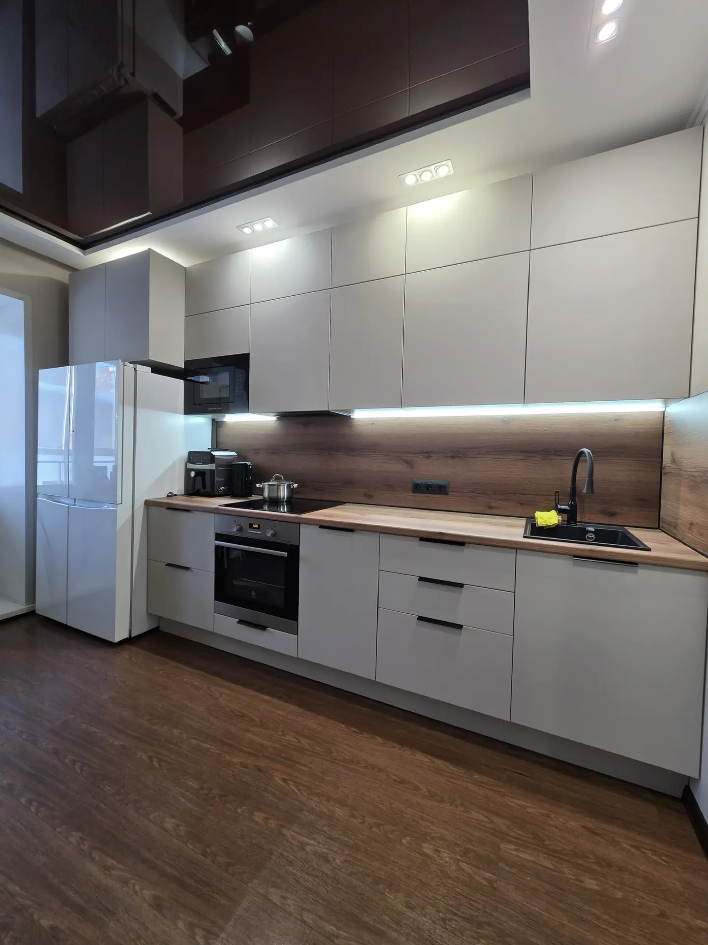 ▪️ Размер: 3600x2600x600 (ШхВхГ) ▪️ Корпус ЛДСП серый ▪️ Фасады МДФ в пленке бежевые ▪️ Ручки торцевые ▪️ Петли с доводчиком GTV ▪️ Сушка для посуды хром