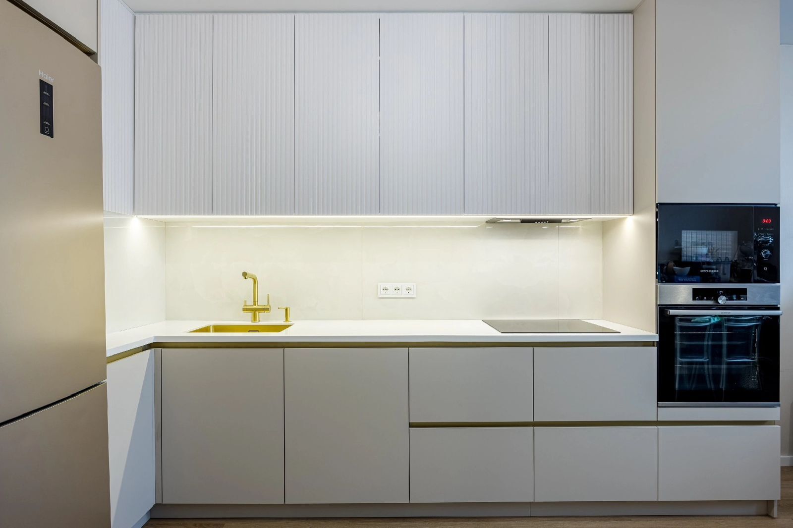 ▪️ Размер кухни: 3200х1200х2500 (ШхВхГ) ▪️ Корпус ЛДСП ▪️ Фасады МДФ в пленке фрезеровка Волна ( Ирбис) ▪️ Столешница искусственнный камень ▪️ Ручка Gola ▪️ Петли Blum (Австрия) ▪️ Подсветка рабочей зоны ▪️ Сушка для посуды хром Boyard ▪️ ЦЕНА С УЧЕТОМ ДОСТАВКИ И СБОРКИ на момент установки