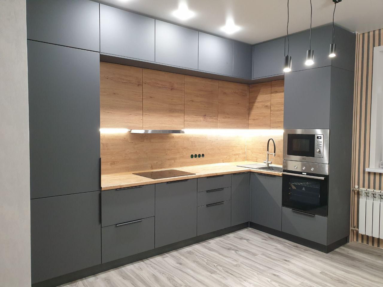 ▪️ Размер: 2400x2570x2300 (ШхВхГ) ▪️ Корпус ЛДСП серый ▪️ Фасады МДФ в пленке графит софт ▪️ Столешница 38 мм ДСП в пластике ▪️ Стеновая панель 6 мм МДФ в пластике ▪️ Ручки торцевые ▪️ Петли с доводчиком GTV ▪️ Направляющие на ящики с доводчиком GTV ▪️ Подъемный механизм верхних газлифты + толкатель ▪️ Мойка искуственный камень ▪️ Подсветка накладной угловой профиль ▪️ Сушка для посуды хром ▪️ Лоток для приборов ▪️ ЦЕНА С УЧЕТОМ ДОСТАВКИ БЕЗ СБОРКИ на момент установки