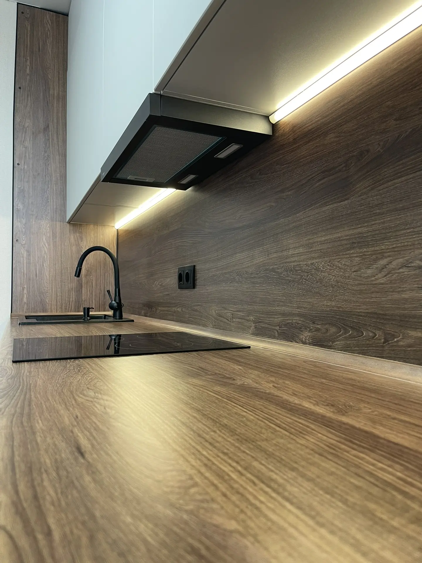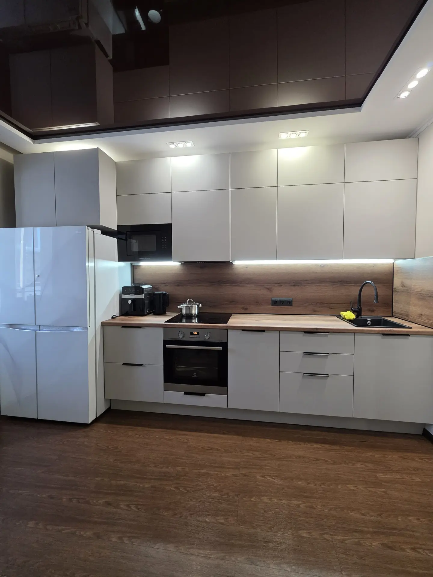 ▪️ Размер кухни: 3900х2600 (ШхВхГ) ▪️ Корпус ЛДСП ▪️ Фасады МДФ в пленке ▪️ Столешница искусственнный камень ▪️ Ручка Gola ▪️ Петли GTV ▪️ Стеклянная витрина с подсветкой черный профиль и стекло бронза ▪️ Сушка для посуды хром Boyard