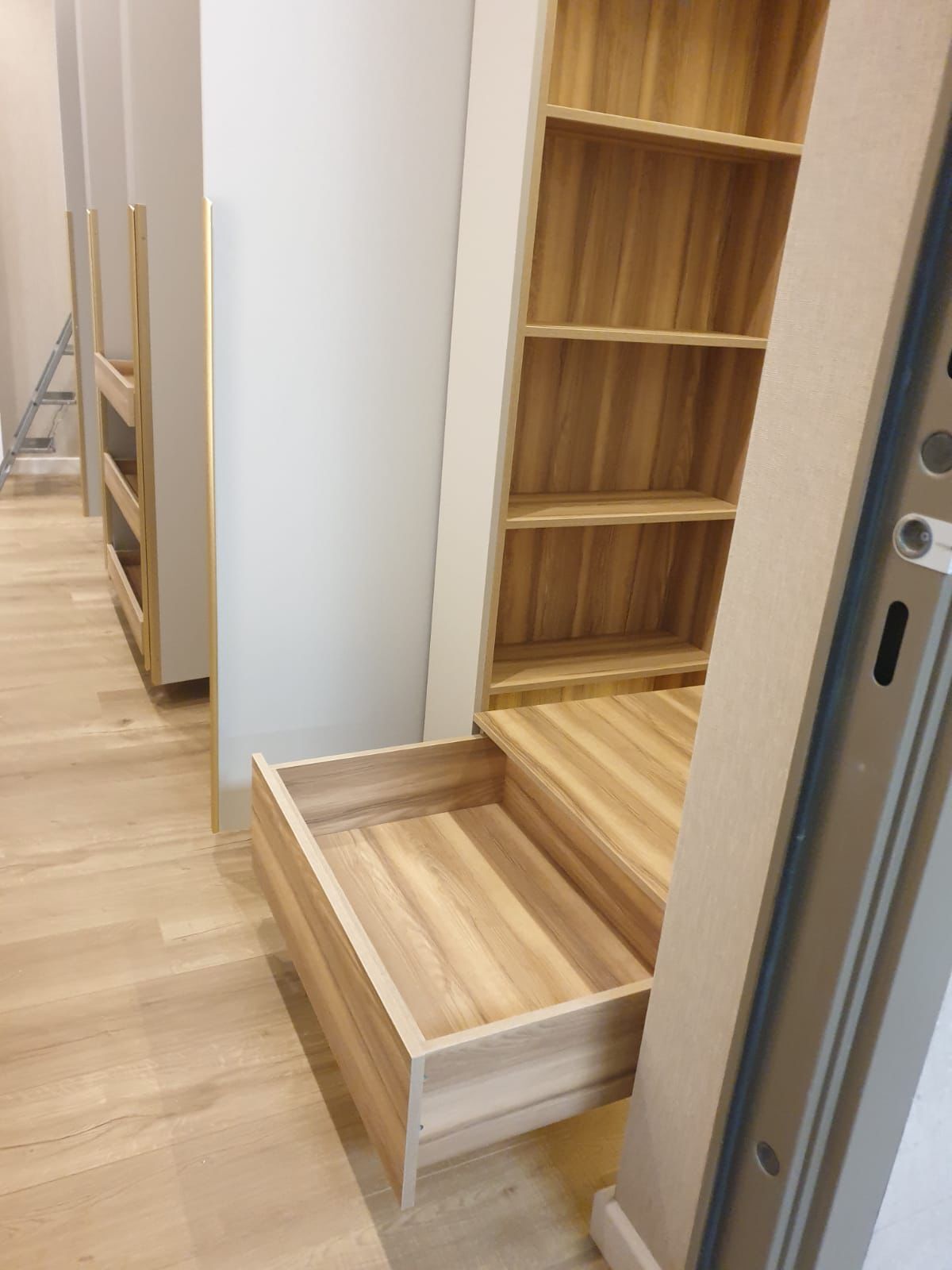 Шкаф распашной в прихожую с открытыми полками и зеркалом